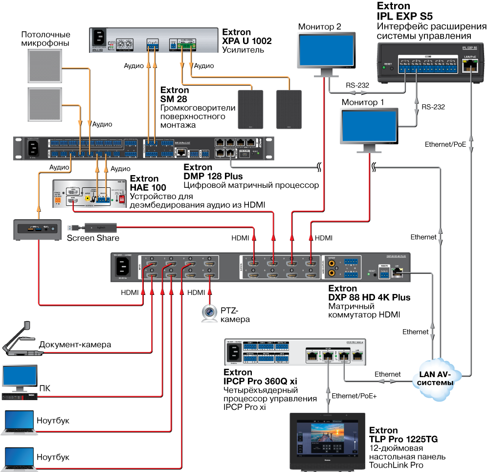 - Эксплуатация, мониторинг и управление AV-оборудованием по стандартной сети Ethernet