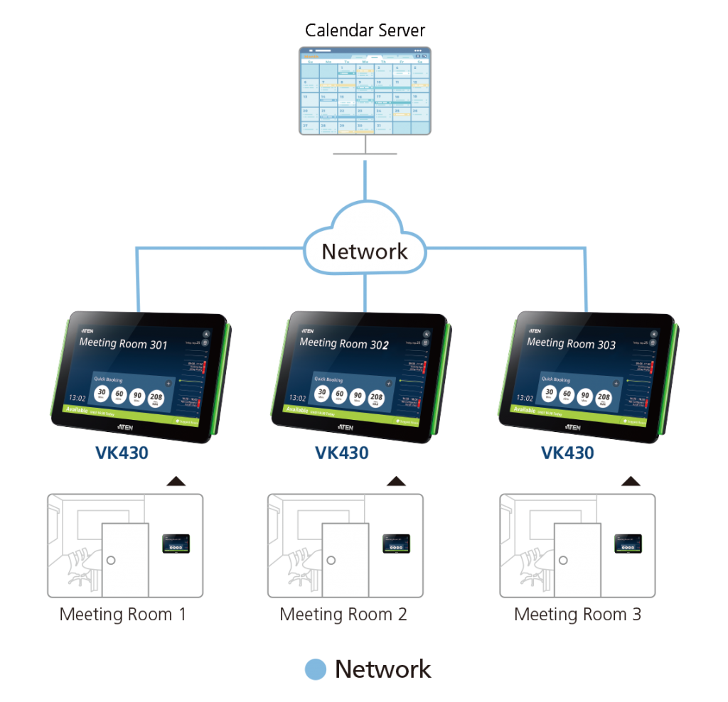Устройство Aten VK430 представляет собой сенсорную панель с диагональю 10,1 дюйма, которая используется для управления конференц-залами. Она централизованно настраивается с помощью конфигуратора системы бронирования (RBS Configurator) – программного обеспечения для централизованного управления панелями бронирования и интеграции с серверами календарей, такими как Календарь Microsoft Office 365, обеспечивая удобное планирование и распределение доступности для всех конференц-залов, внесенных в систему. Таким образом, наделенный полномочиями персонал с помощью нескольких простых нажатий в удобном пользовательском интерфейсе, может выполнять бронирование конференц-зала, изменять сроки или освобождать использование помещения, а также незамедлительно проверять расписания бронирования любого конференц-зала. Кроме того, с помощью конфигуратора системы бронирования администраторы могут в режиме реального времени централизованно просматривать доступность и расположение всех конференц-залов, а также управлять на расстоянии каждым подключенной панелью VK430, повышая эффективность использования конференц-залов.