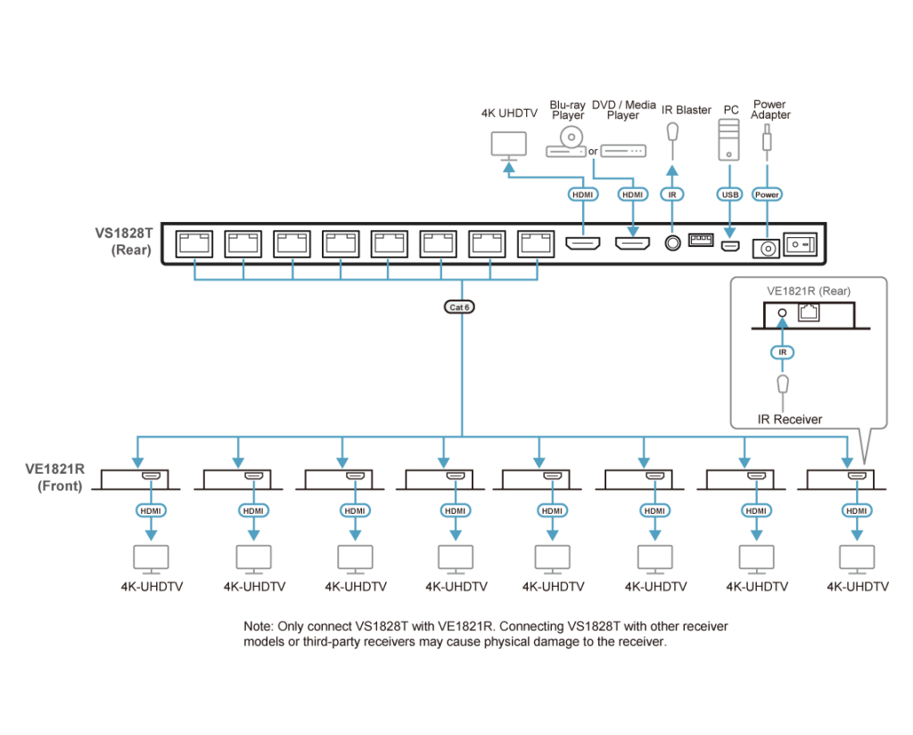 В комплект поставки входит 1 ИК-кабель для разветвителя и 8 ИК-кабелей для приемников, что позволяет пользователям удаленно управлять устройством-источником со стороны приемника. Благодаря подключению в режиме «plug-and-play» не требуется установка программного обеспечения, за счет чего достигается легкость и быстрота развертывания. Комплект VS1828KIT обеспечит превосходное качество передачи аудио/видео сигналов и гибкость в различных сценариях установки, таких как конференц-залы, магазины, развлекательные системы и т. д.