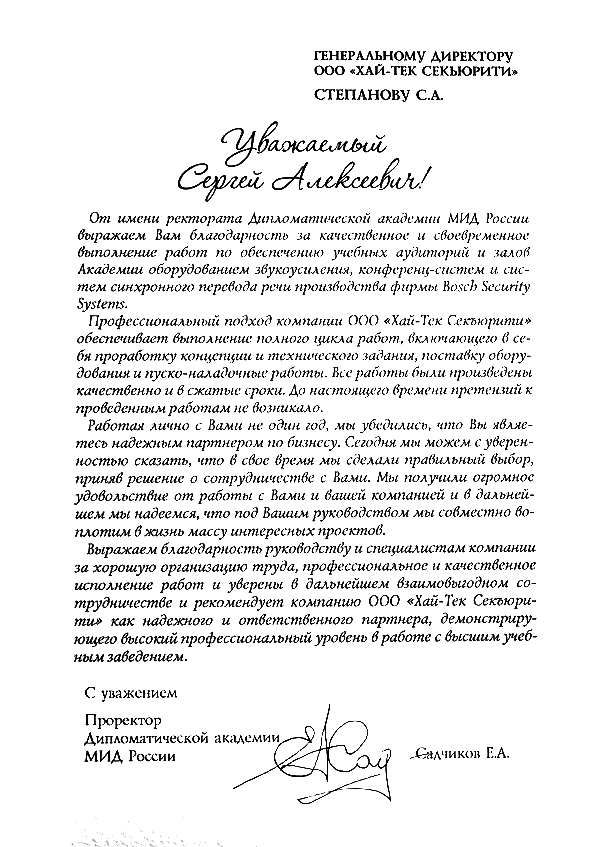 Дипломатическая академия МИД России по итогам долгосрочного сотрудничества выражает благодарность ООО «Хай-Тек Медиа», а также его сотрудникам.