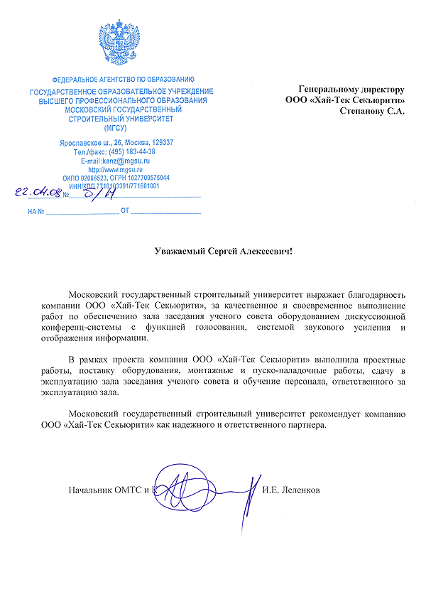 В рамках проекта компания выполнила проектные работы, поставку оборудования, монтажные и пуско-наладочные работы, сдачу в эксплуатацию зала заседания ученого совета и обучение персонала, ответственного за эксплуатацию зала.