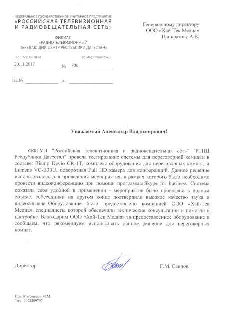 ФФГУП "Российская телевизионная и радиовещательная сеть" "РТПЦ Республики Дагестан" провела тестирование системы для переговорной комнаты в составе: Biamp Devio CR-1T, комплекс оборудования для переговорных комнат, и Lumens VC-B30U, поворотная Full HD камера для конференций. Данное решение использовалось для проведения мероприятия, в рамках которого было необходимо провести видеоконференцию при помощи программы Skype for business. Система показала себя удобной в применении - мероприятие было проведено в полном объеме, собеседники на другом конце подтвердили высокое качество звука и видеосигнала.