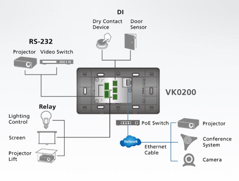 Устройство VK0200, представляет собой полностью настраиваемую 12-кнопочную панель управления, которая в качестве единого решения, объединяет в себе контроллер системы и блок клавиш (клавиатуру). VK0200 является решением, готовым к использованию и предназначенным для управления конференц-залом или учебной аудиторией малого/среднего размера. Он позволяет легко подключать устройства, а затем выполнить настройку с помощью интуитивно понятного программного конфигуратора VK6000. Для удовлетворения требований большей части возможностей применения, как функции кнопок, так и их расположение могут быть гибко настроены.