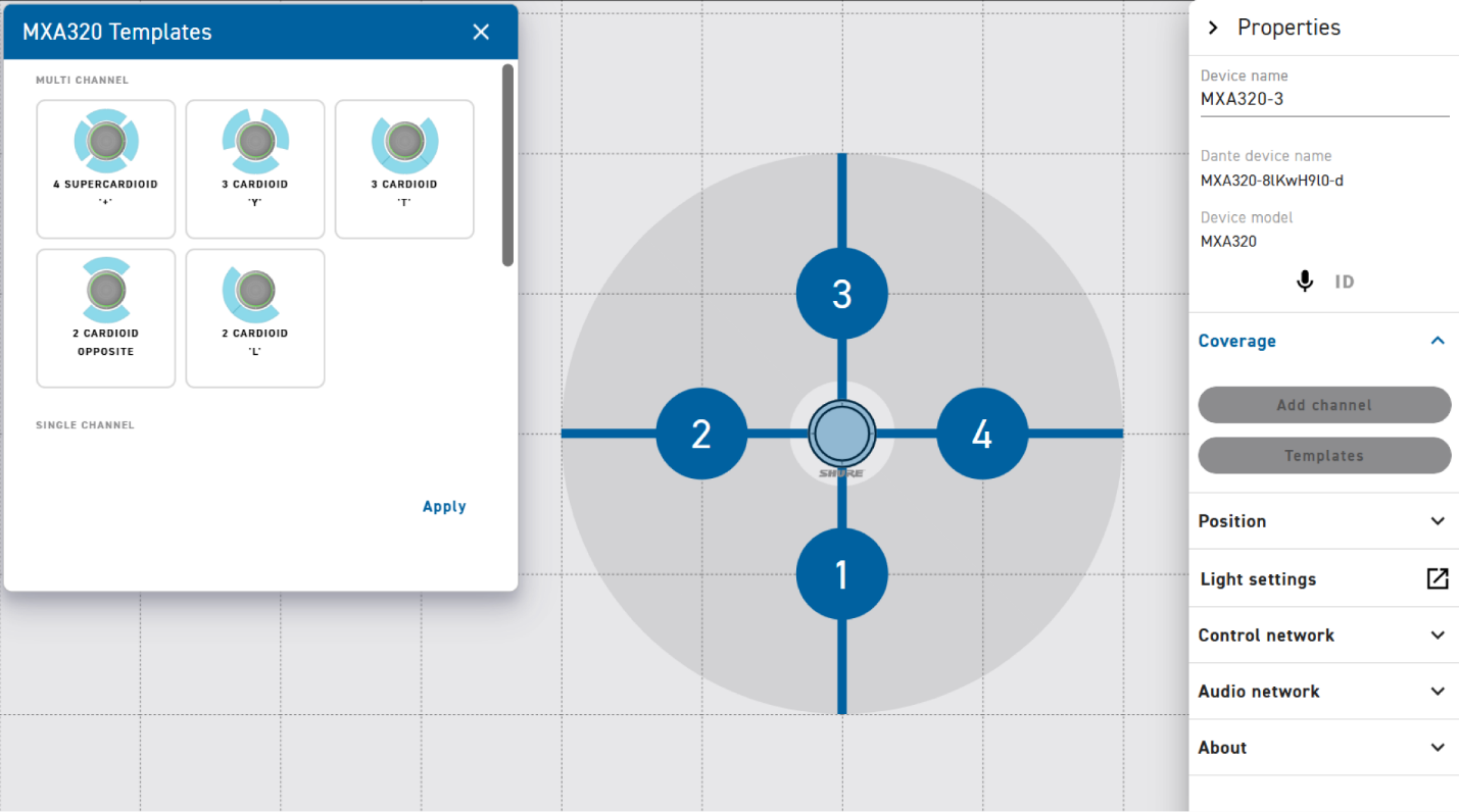 • Параметры захвата звука можно настраивать визуально в программном обеспечении Shure Designer, что позволяет удобно отображать зону покрытия MXA320 вместе с другими продуктами экосистемы Microflex в одном помещении
