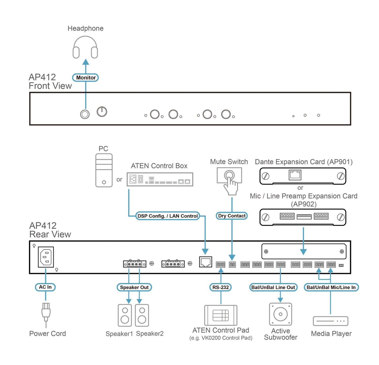 ATEN AP412 – 4-канальный усилитель оснащен встроенной функцией цифровой обработки сигналов (DSP), мощность составляет 120 Вт, на борту входы для балансных/небалансных сигналов микрофонного/линейного уровня и подключение нагрузки 4/8 Ом или 70/100В. Он так же обладает возможностью работы в мостовом режиме для обеспечение большей мощности.