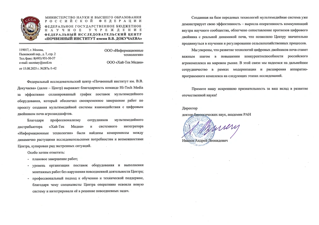 Федеральный исследовательский центр «Почвенный институт им. В.В. Докучаева» (далее ─ Центр) выражает благодарность команде Hi-Tech Media за эффективно спланированный график поставок мультимедийного оборудования, который обеспечил своевременное завершение работ по проекту создания мультимедийной системы взаимодействия с цифровым двойником почв агроландшафтов...