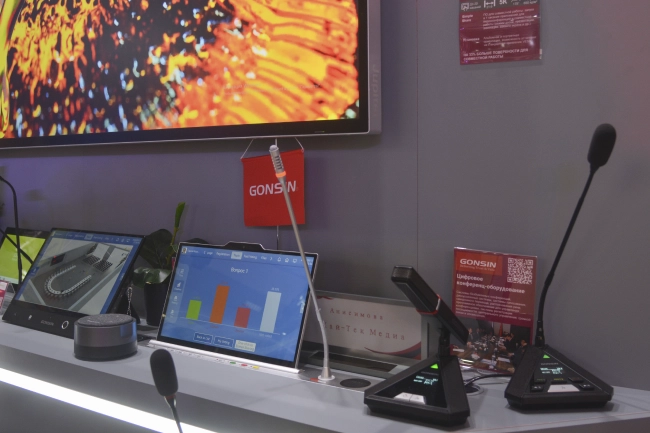 - лаконичный серебристый терминал Gonsin GX-LF156CX-X с ультратонким выдвижным монитором и микрофоном демонстрировал быстрый, плавный и бесшумный подъем;